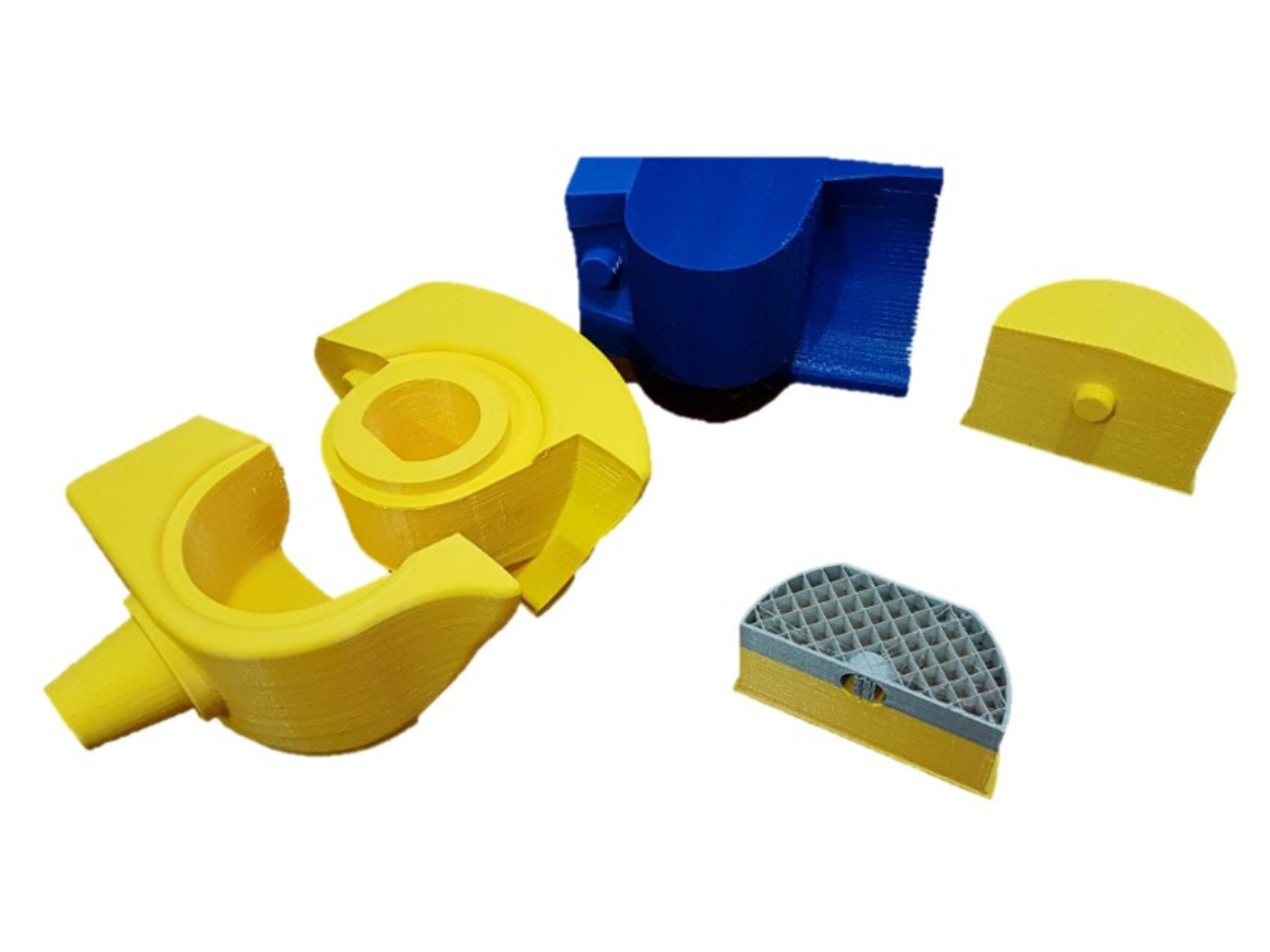 Protótipos e componentes impressos através de tecnologia 3D para fabricação futura.